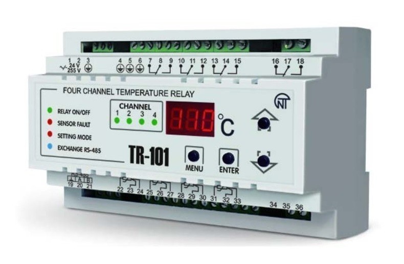 Цифровое температурное реле ТР-101 предназначено для измерения и контроля температуры устройства по четырем независимым датчикам, подключаемым по двух- или трехпроводной схеме, с последующим отображением температуры на дисплее.