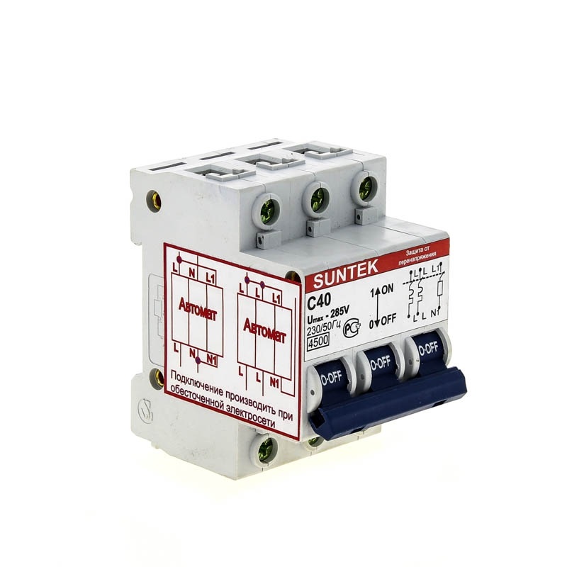 SUNTEK-C – трехмодульный автоматический выключатель с установкой на DIN-рейку. Первые два модуля выполнены как автоматические выключатели, которые срабатывают от токов короткого замыкания. В третьем модуле встроенный блок контроля и выключения. Устанавливается на вводе эл. энергии. При трехфазном питании устанавливаются на каждую фазу.