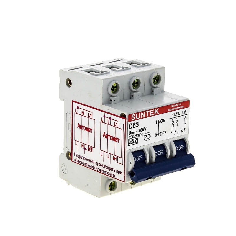 SUNTEK-C – трехмодульный автоматический выключатель с установкой на DIN-рейку. Первые два модуля выполнены как автоматические выключатели, которые срабатывают от токов короткого замыкания. В третьем модуле встроенный блок контроля и выключения. Устанавливается на вводе эл. энергии. При трехфазном питании устанавливаются на каждую фазу.